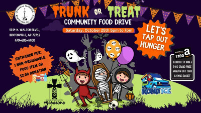 Parents and grandparents, you have an opportunity to take your kids to a Trunk or Treat this Saturday, October 25, from 5-7 pm at 1114 N Walton Blvd, which is a multi-business location. The businesses will provide the treats for you and your kids; your entrance fee is one can of non-perishable food item or $2.00. The businesses will donate the entrance fee/food to Second Street Pantry Missions. Kids get treats, and our non-profit will get food.