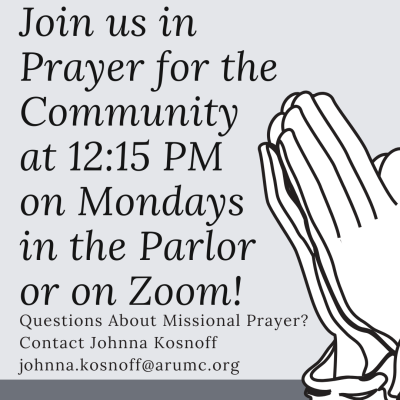 Join Missional Prayer for a 30-minute time of prayer in the Parlor or over Zoom every Monday from 12:15 to 12:45 PM. No weekly commitment is required—come when you can! If you'd like to join or simply see what it's all about, please contact Johnna Kosnoff at