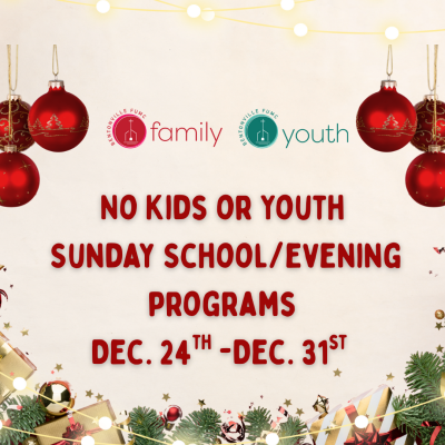 Beginning Wednesday, December 24th through Wednesday, December 31st we will not have Sunday School or evening programming. We hope you join us for one of our Christmas eve services, and we will see you in the new year!