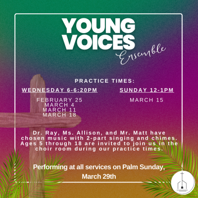 Kindergarteners through 18 year old's are invited to participate in our Young Voices Ensemble for the first 20 minutes of our Wednesday evening programming every week until Palm Sunday. Join us to see what it's all about!