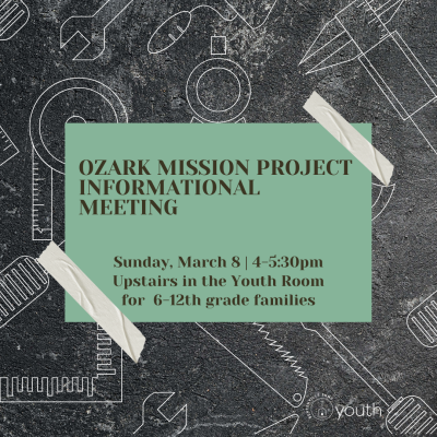 6th-12th grade families are invited to attend our Ozark Mission Project informational meeting on Sunday, March 8th from 4-5:30pm in the youth room. OMP's Jules Anderson will be joining us to share what this organization is all about! If your student is thinking about traveling to Ozark Mission Project with us this summer, June 21st-26th in Maumelle, we encourage your family to attend this meeting.
