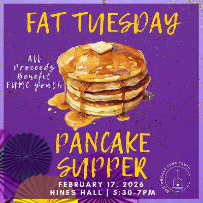 Join us on Fat Tuesday, February 17th, for a pancake supper in Hines Hall from 5:30-7pm. All proceeds will benefit FUMC Youth!